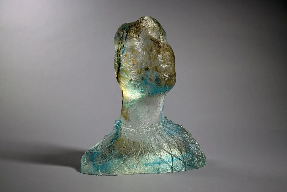"Tishkila" is a figurative portrait bust, her gaze subtly lifted to the left in a silent testament to aspiration and reverence. Around her neckline is a meticulously handcrafted beaded collar necklace, a tribute to the timeless art of beadwork that thrives in both traditional and contemporary settings. The sculpture, with its dimensions of 11.5 inches in height, 10 inches in width, and 4 inches in depth, is a limited edition series of 9. Each piece serves as a vivid embodiment of the mastery of Murano glass production, a craft that I have come to deeply respect and admire.